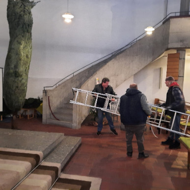 Unter der Regie von Adriana Andreica führten Uwe, Schorsch und Roland die Schmückung in der Kreuzkirche durch. Damit der große Stern an die Spitze gesetzt werden konnte, musste die große Staffelei mit Zusatzleiter komplett ausgefahren werden. Unser Leichtgewicht Uwe, wagte sich ganz nach oben, bis die letzten Stufen erreicht waren. Original-Ton: „Weida geh´ ich fei nimma aufi!“