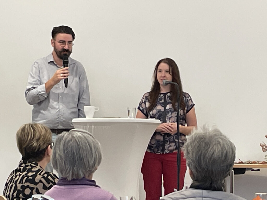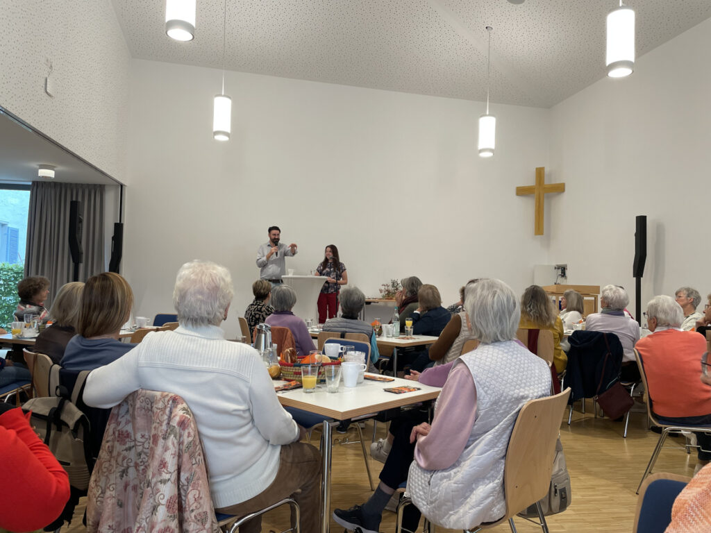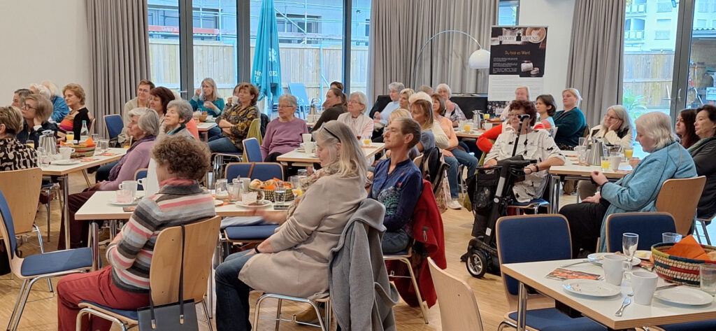 Schon der freundliche Empfang, die herbstlich ansprechend gedeckten Tische und die empathische Begrüßung der Organisatorin Jutta Schmähl ließen sehr schnell angeregte Gespräche an den sehr gut besetzten Tischen in Gang kommen. Nur die Ankündigung des eröffneten reichhaltig bestückten und schön anzuschauenden Frühstückbuffets ließen die Gespräche kurzzeitig verstummen.