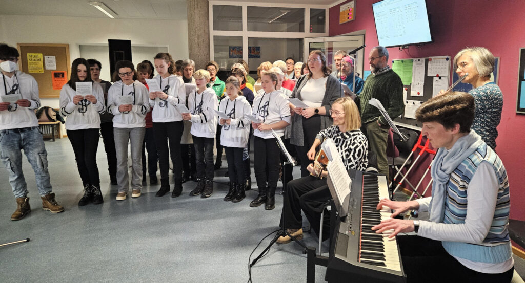 Zur ersten ökumenischen Gebetstunde in 2025 hatten sich wieder ein stattlicher Kreis von Gläubigen in der Schulaula eingefunden. Sie wurden vom evangelischen Pfarrer Jürgen Henrich begrüßt. Er sprach die Hoffnung aus, dass die Menschen in schweren Zeiten wie wir sie aktuell erleben, im Vertrauen auf Gott zusammenhalten und nicht resignieren. „Dieses Vertrauen sollten wir aufbringen, denn er ist es, der das Haus des Lebens und der Liebe zusammenhält“, so Henrich weiter. Auch der für diese Feier als Thema ausgewählte Psalm 23, der Hirtenpsalm Davids beschreibt das tiefe Vertrauen, das David in den Herrn seinen Gott hat und das er in einfachen, ermutigenden Worten beschreibt. Musikalisch gestaltet wurde die Feierstunde von dem Lobpreischor Teisendorf verstärkt mit Mitgliedern des Teeniechors unter der Leitung der Kirchenmusikerin des katholischen Pfarrverbandes Teisendorf, Cäcilia Sommer. Als Instrumentalisten begleiteten Cäcilia Sommer (Örgel, Frederika Prinke (Querflöte), Stefanie Eder (Gitarre) und Johanna Aicher (Percussion) den Chorgesang. Die Lieder konnten von allen mitgesungen werden. Dazu waren zu Beginn Textblätter verteilt worden.
