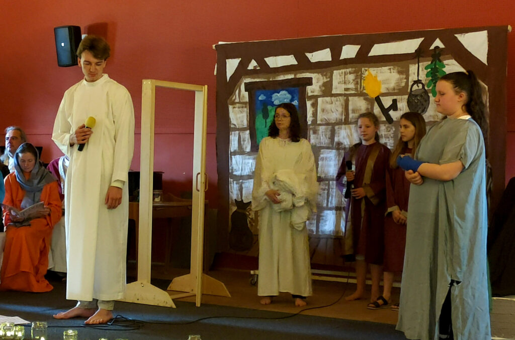 Mit dem Musical „Er lebt“ von Matthias Fruth führten Chor und Musiker*innen (unter der Leitung von Svetlana Flat, Susanne Wiesinger und Silvia Jarosch-Wiesinger) das Geschehen vom Ostermorgen in Liedern und Spielszenen vor Augen. Die lebendige Musik nahm alle Beteiligten auf und vor der Bühne mit in die Gefühlswelten der Jünger*innen und Freund*innen von Jesus: Die tiefe Traurigkeit nach seinem Tod konnten die Sänger*innen genauso rüberbringen wie die Freude und Begeisterung, als klar wurde, dass Jesus auferstanden war. Eingebettet wurde das Musical in Gebete und Segen der beiden Pfarrer der katholischen und evangelischen Gemeinden in Ainring-Mitterfelden, Wernher Bien und Jürgen Henrich.