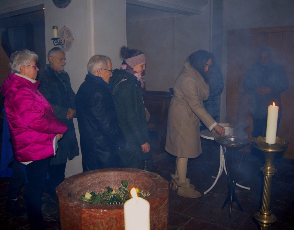 Bei der ersten konnten Gebete mit einem „Kerzerl“ erhellt werden, bei Station 2 stieg der Dank und die Bitten mit Weihrauch zum Herrn und schließlich konnte alle ihre Liebe persönlich unter den Segen Gottes stellen.