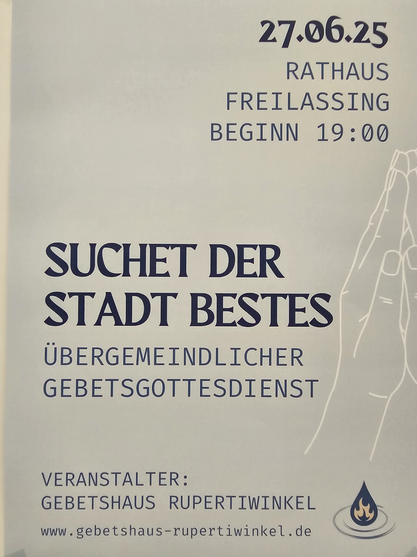 Wir laden herzlich ein zu einem übergemeindlichen Gebetsgottesdienst im Rathaus Freilassing unter dem Motto "Suchet der Stadt Bestes". Veranstalter ist das Gebetshaus Rupertiwinkel
